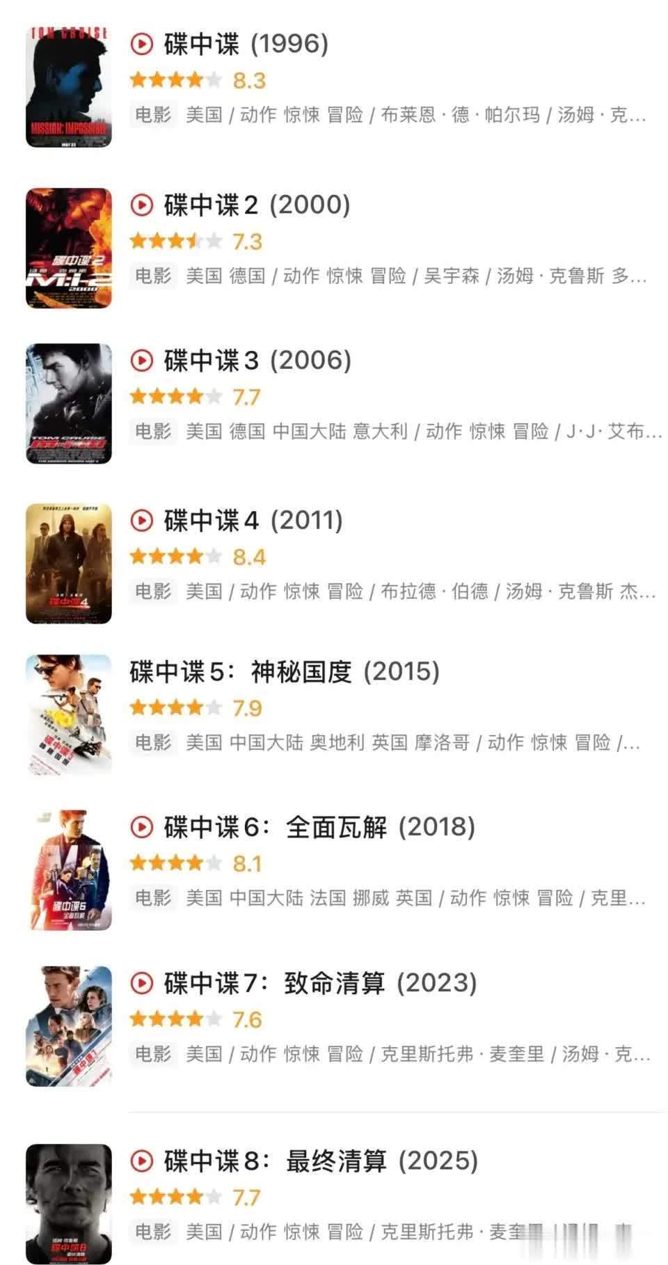 看完《碟中谍8:最终清算》后,我又翻阅了一遍前七部的豆瓣评分,可以说这个系列几乎是凭借着高口碑一路延续下来的,而这部电影也为整个系列画上了最完美的句号。